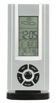 Modern designed weather station which shows the current temperature, humidity, date and time. A picture in the display shows weather conditions. This station is furthermore equipped with a hygrometer and alarm function. Powered by 1x AAA battery.