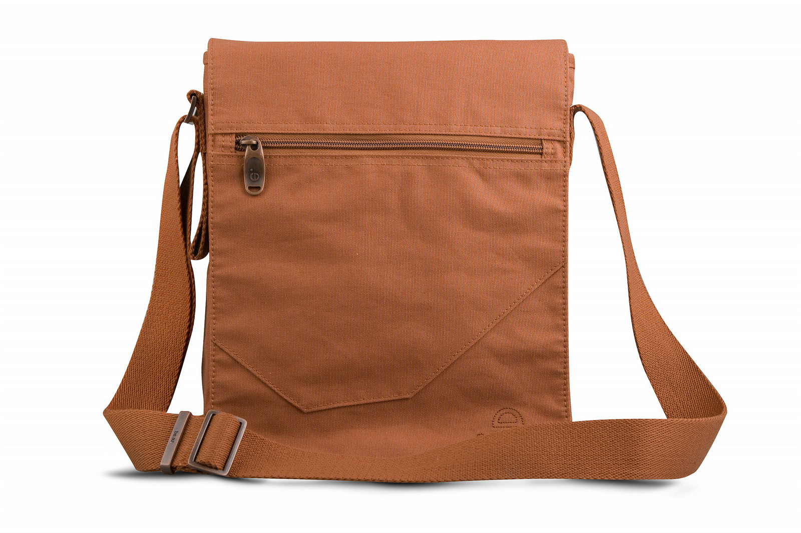 Obvious-ones are the quality thick canvas of rust color, the custom-cut panel on the flap and its aged copper looking metal hardware. Notice also the 45 degress angles of the bag, matching the shape of the flap perfectly. But looking more closely, you would notice the discreet "dot e" made of a single line embrodery on the flap, under which a double slip pocket awaits for accessories you want to keep at a reach of hand.