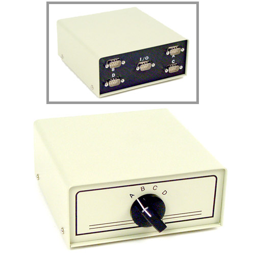The Manual Serial SwitchBox with DB9 male serial ports. Ideal for linking four computers so they can share a serial printer or modem, or allows one computer to share four serial printers and a serial modem or any other combination.