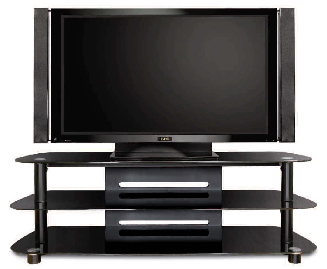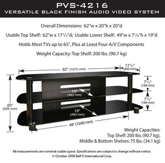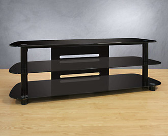 Long, low and lovely, this contemporary design constructed of deep black tempered safety glass, scratch resistant powder-coated metal and MDF will accommodate up to most 63" Flat Panel TVs, DLP or LCD Projection TVs or most Direct View TVs, plus up to 6 or more audio video components and a center channel speaker. It includes an integrated Bell'O® CMS® Cable Management System to hide wires and interconnect cables.