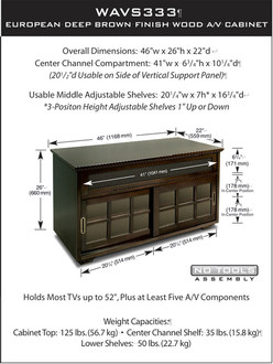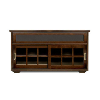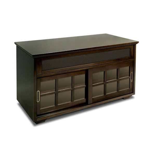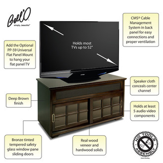 This beautiful European deep brown finish audio/video cabinet assembles in minutes with no tools. It can accommodate most flat panel TVs up to 52", plus at least 5 A/V components with a speaker cloth covered shelf for a center channel speaker. This model is accented by elegant sliding wood lattice doors with bronze tinted tempered safety glass. An integrated CMS® Cable Management System with interior slots hides and routes wires and interconnect cables and air flow vents provide proper air circulation. An optional PP-59 flat panel TV mounting system is also available for this model.