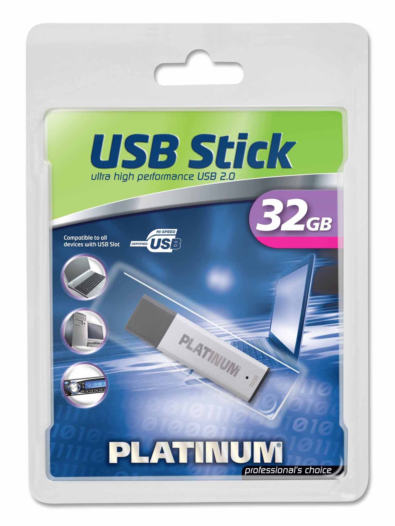Bestmedia PLATINUM HighSpeed USB Stick 32 GB. Capacity: 32 GB, USB version: USB 2.0, USB connector: Type-A. Colour of product: Silver. Width: 17 mm, Depth: 59 mm, Height: 7 mm. Compatible operating systems: Windows XP/2000/Vista, MacOS, Linux 2.4.0