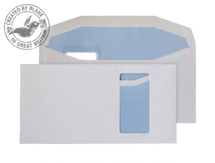 White, DL+ 121x235mm, Window 90 x 45mm, 15up, 150lhs, Gummed, Pack 1000, 90 GSM, Mailing Wallet, Blue Hatch Security Opaque