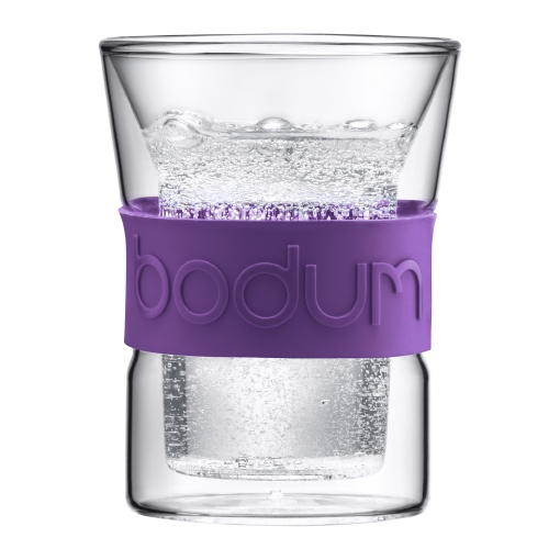 Presso, 2 pcs glass, double wall, 0.2 l, 6 oz Purple The latest addition to our extensive double-wall glass collection: the Presso cup to go with our Presso coffee press. The silicone band that wraps the glass gives you a firm grip on your morning coffee. Or your afternoon ice tea for that matter. The insulating quality of the double-wall glasses doesn't just keep hot drinks hot for a longer period of time, it also keeps cold drinks cold longer. Another nice thing about them – there is no condensation water when you serve cold drinks, therefore no messy rings on your table. And by the way, they're great for ice cream as well. Double-wall glasses are truly multifunctional. They are made from borosilicate glass and are dishwasher safe.