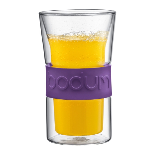 Presso, 2 pcs glass, double wall, 0.3 l, 10 oz Purple The latest addition to our extensive double-wall glass collection: the Presso cup to go with our Presso coffee press. The silicone band that wraps the glass gives you a firm grip on your morning coffee. Or your afternoon ice tea for that matter. The insulating quality of the double-wall glasses doesn't just keep hot drinks hot for a longer period of time, it also keeps cold drinks cold longer. Another nice thing about them – there is no condensation water when you serve cold drinks, therefore no messy rings on your table. And by the way, they're great for ice cream as well. Double-wall glasses are truly multifunctional. They are made from borosilicate glass and are dishwasher safe.