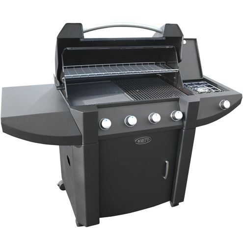 Boretti Robusto. Total power: 4600 W, Type: Barbecue, Heat source: Gas. Form factor: Cart, Top surface type: Grate + Griddle, Colour of product: Black. Width: 1200 mm, Depth: 640 mm, Height: 1610 mm