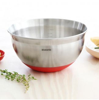 The gently curved edge is specially designed to hold the bowl in the optimal mixing position, while the silicone base coating prevents the bowl from slipping and is heat resistant up to 220ºC. The measurements on the inside of the bowl make it simple to mix ingredients accurately.