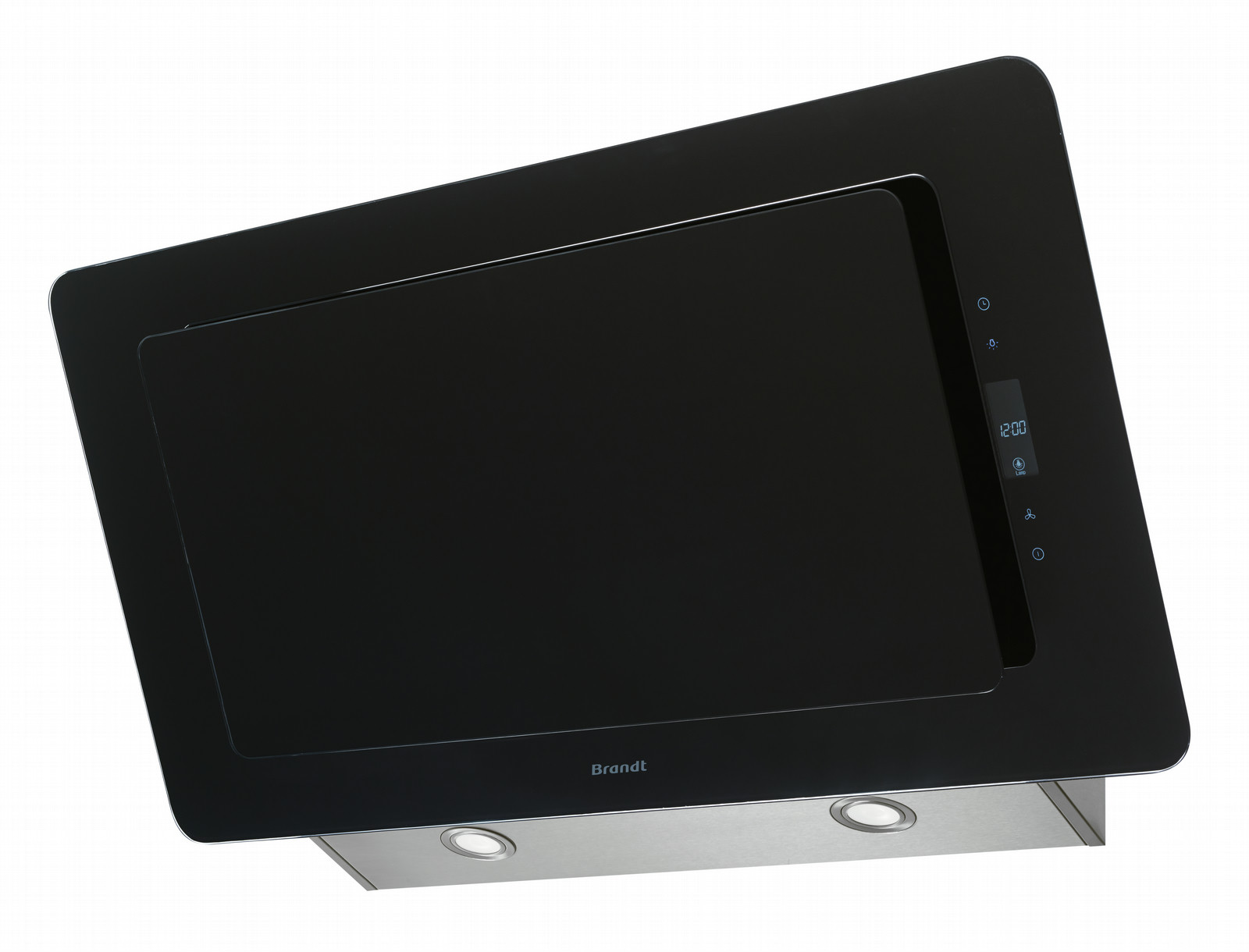 Brandt BHV6961B. Maximum extraction power: 598 m³/h, Type of extraction: Ducted/Recirculating, Noise level: 72 dB. Type: Wall-mounted cooker hood, Colour of product: Black, Lamps quantity: 2 lamp(s). Grease filter type: Aluminium, Number of filters: 1 pc(s). Connected load: 230 W, Bulb power: 3 W, AC input voltage: 220-240 V. Width: 900 mm, Depth: 430 mm, Height without chimney: 53 cm