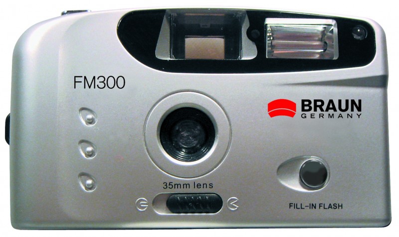 BRAUN FM300 - 35 mm, flash, Red-Eye-Reduction, 2x AA, strap, pouch, silver