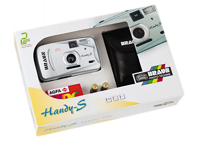 BRAUN Handy - 35 mm Compact camera, flash, Red-Eye-Reduction, colour film, 2x AAA, strap, pouch, silver