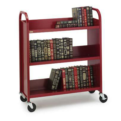 Features three deep slanted shelves and 4" quiet glide heavy duty casters. Ships assembled, except for the casters.
