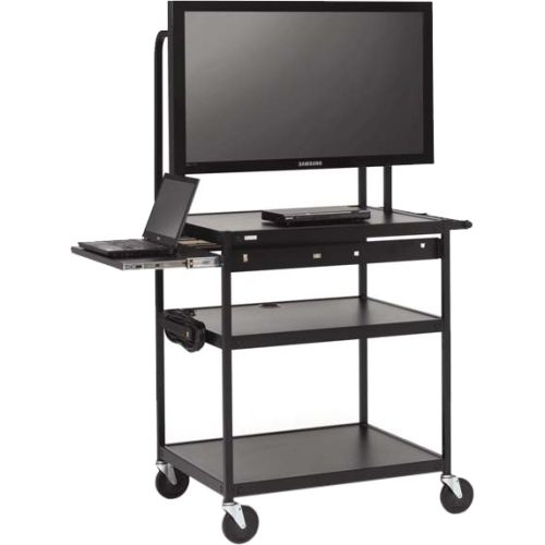 UL listed for schools to support a flat panel monitor up to 75 lbs, suggested for 26" to 42" flat panel. Locking lower cabinet for storage and additional shelves support extra equipment. Adjustable mounting bracket supports a mounting hole pattern up to 700mm wide by 400mm high. UL Listed to 1667 standards for tall institutional carts.