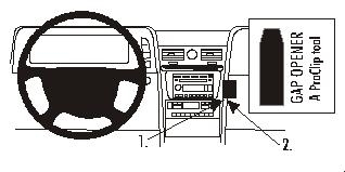 1. Place the ProClip over the padded console edge and press the thin end of the enclosed gap opener into the gap between the center console panel frame and the console edge, to widen the gap. Press forward on the left side of the ProClip so the grooved edge goes into the gap. Press until you see or hear/feel it snaps into place. Pull out the gap opener