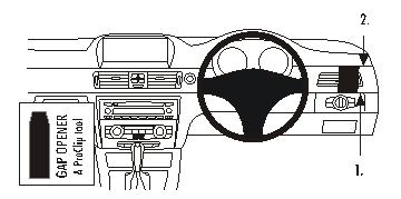 2. Slide the grooved edge on the lower part of the ProClip into the gap next to the gap opener. Slide the gap opener, while in the gap, further towards the steering wheel to keep the gap widened and place it above the light switch. Slide the ProClip further into the gap so it is positioned next to the gap opener. Pull out the gap opener.