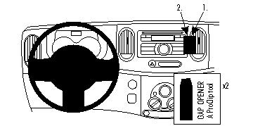 1 and 2. Use the enclosed alcohol pad to clean the area where the ProClip is to be installed. Press the thin end of the enclosed gap openers into the gap between the stereo and the surrounding panel frame, to widen it. Peel off the cover of adhesive tape on the ProClip. Press the angled edge on the right side of the ProClip into the seam between the air vent wall and the surrounding panel frame.