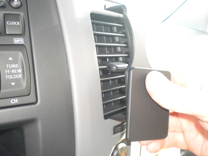 1. Use the enclosed alcohol pad to clean the area where the ProClip is to be installed. Peel off the adhesive tape cover on the ProClip. Place the angled edge on the lower part of the ProClip into the bottom part of the air vent. Press it down into the seam/gap between the air vent and the surrounding panel frame. Note: if the angled edge is hard to get into the gap, pull the panel frame firmly towards to widen the gap slightly and then press the angled edge into the gap.