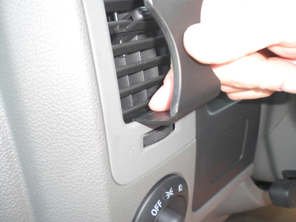 2. Press firmly down on top of the ProClip so it flexes downward. Hook the angled edge into the seam/gap between the air vent and the surrounding panel frame.