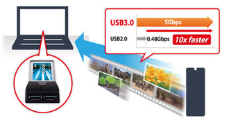 SuperSpeed USB 3.0 interface transfers data at up to 5 Gbps, 10 times faster than USB 2.0, 480 Mbps transfer speed.