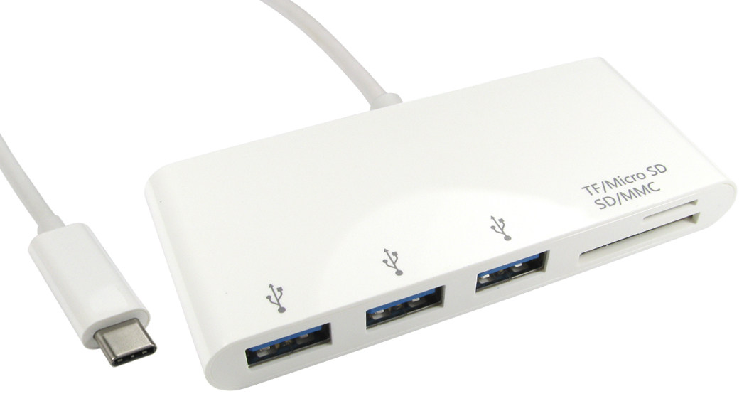 The USB3C-HUB3CR is a USB-C to three USB 3.0 hub with a Micro SD and SD/MMC port. The USB 3.0 port allows you to connect a USB device or another hub to the host USB-C computer, the Micro SD and SD/MMC port allows you to access memory cards on the host PC. It can work with Macbook’s or Google’s Chromebook Pixel as well as other USB-C supported devices.