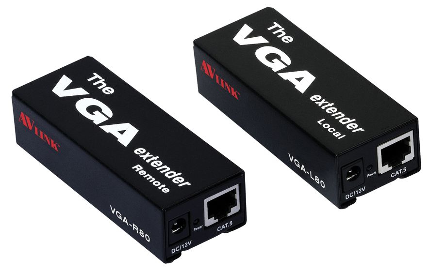 Extend the distance between the PC and the display by 80 metres. The local unit receives the video signal from the PC and sends the signal to the remote unit(s) through a length of Cat5e cable. The remote unit connects to the display monitor. The power supply can be connected to either local or remote unit.
