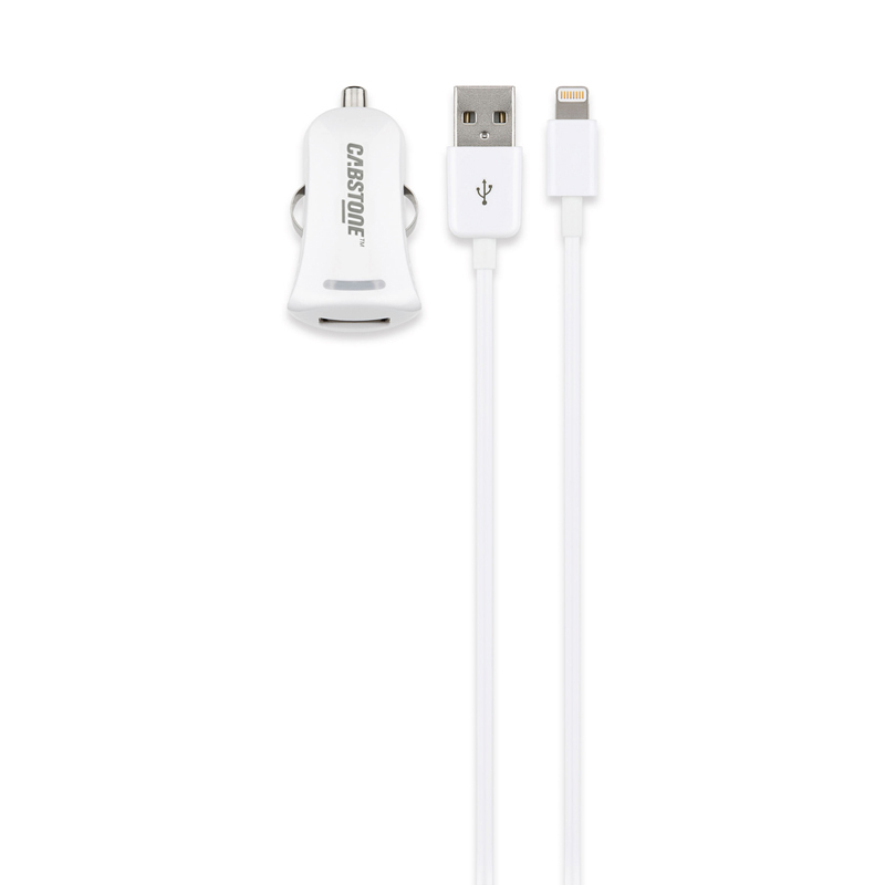 <b>USB car charger with Micro-USB cable, Apple Dock Connector cable, or Apple Lightning Connector cable</b>