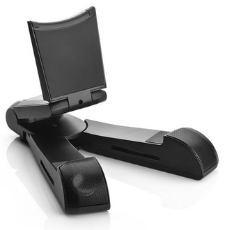 The SoundStand has been specifically designed for tablets such as the Apple iPad or Galaxy Tab from Samsung. It safely supports tablets like an easel. The SoundStand boasts premium material and workmanship, as well as a clever design. Folded, it is very small; when unfolded, it can hold a tablet, and thanks to its rubberized spots, will hold it securely. The two devices will form a compact unit that makes it even easier to enjoy movies and music videos.