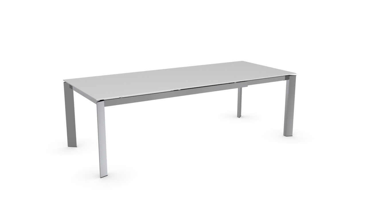 The BARON table contains a handy mechanism able to increase the top surface. Pull the frame towards you so that the two legs with hidden castors slide on one side allowing the leaf to be pulled out. With a simple rotation the leaf fitted on metal tracks comes out of its housing and lines up with the top. The triangular or rectangular legs stay at the perimeter, ensuring maximum comfort for all guests.