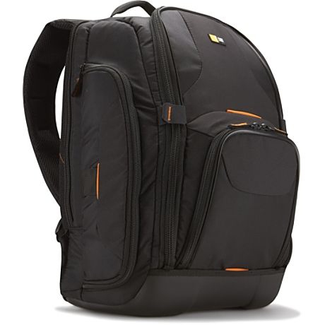 - Backpack holds SLR camera body with attached zoom lens, laptop and additional accessories