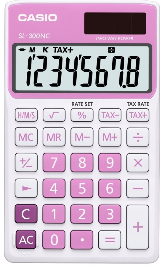 Casio SL-300NC. Form factor: Pocket, Type: Display calculator, Colour of product: Pink. Control type: Buttons. Storage media type: Not available. Power source: Battery/Solar, Battery type: LR54. Width: 70 mm, Depth: 118.5 mm, Height: 8 mm