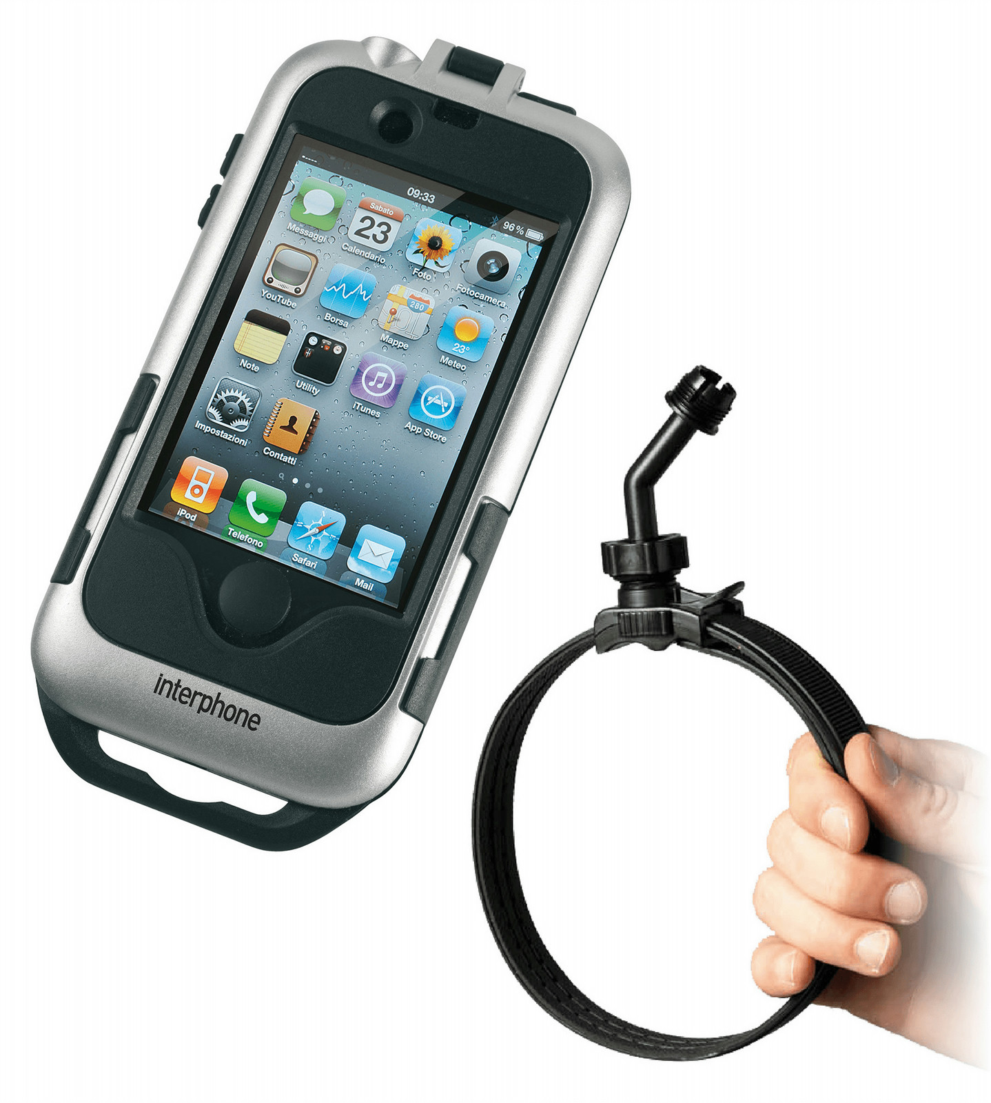 Water resistant case for carrying iPhone® 4S/4 on motorcycles and bicycles. A very sturdy external housing and knock-proof internal rubber shell provide your device with total protection. The mounting bracket with safety closure is adjustable over a full 360° so you can arrange your iPhone® 5 in the best position possible. All iPhone® 4S/4 functions are available with the phone in the case, including the Touch Screen function, plugging in the earphones, and using the battery charger.