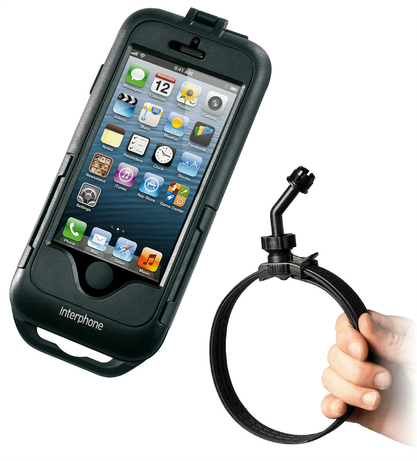 Water resistant case for carrying iPhone® 5S/5 on motorcycles and bicycles. A very sturdy external housing and knock-proof internal rubber shell provide your device with total protection. The mounting bracket with safety closure is adjustable over a full 360° so you can arrange your iPhone® 5S/5 in the best position possible. All iPhone® 5S/5 functions are available with the phone in the case, including the Touch Screen function, plugging in the earphones, and using the battery charger.