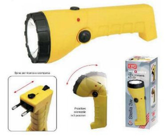 CFG E404. Flashlight type: Hand flashlight, Colour of product: Yellow, Housing material: Acrylonitrile butadiene styrene (ABS). Lamp type: LED, Luminous flux: 96 lm. Battery life: 22 h, Battery life (max): 22 h, Charging time: 12 h. Depth: 210 mm, Height: 80 mm. Number of products included: 1 pc(s), Package type: Box