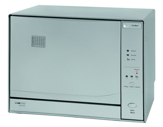 Clatronic TSG 704. Type: Freestanding, Door colour: Silver, Control panel colour: Silver. Noise level: 63 dB, Drying class: C, Dishwashing programs: Intensive, Normal, Quick. Energy efficiency class: B, Energy consumption per cycle: 0.65 kWh, Water consumption per cycle: 10.4 L. Width: 480 mm, Depth: 465 mm, Height: 570 mm