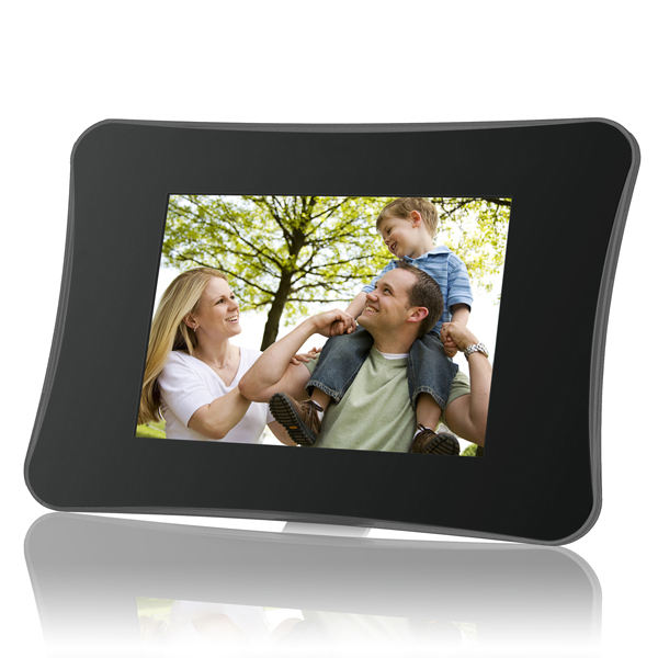Show off your photo memories in this sleek contemporary frame, featuring a glossy black design and a vibrant, widescreen 7" LCD screen. Store your favorite photos and videos directly on the frame with 1GB of built-in memory, set your photos to music with MP3 audio playback, and create and enjoy dazzling video slideshows with included PC software. A full-size USB port and multiple memory card slots make transferring files fast and easy. Integrated speakers, calendar and alarm clock functions also included.