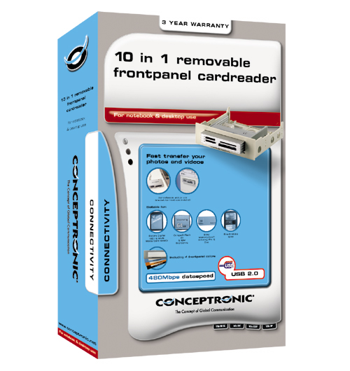 This 10 in 1 frontpanel cardreader/writer reads and writes digital photos & videos and transfers them in very fast to your notebook or PC and vice versa. Faster and easier than transfer via digital camera. Nearly all kinds of memory cards are supported. <p>