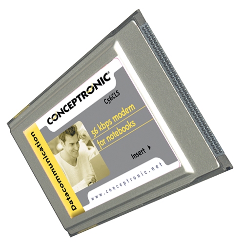 This controllerbased Conceptronic fax/modem PC-Card is type II slot compatible and sends and receives data with the speed of V92 56 kbps. The PC-Card is suitable for internet, teleworking, telebanking, BBS and faxing (14K4).
