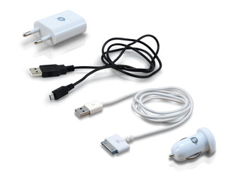 This USB Charging Kit allows you to charge most of your mobile devices at home, in your car, boat or truck without the need of a PC or notebook. With the USB to Micro-USB cable and Apple cable, you can charge devices with many different connections with this kit, like your iPod, iPhone, Samsung, BlackBerry, or Motorola phone and most devices with a Micro-USB connector, like navigation systems, MP3 players and digital cameras.