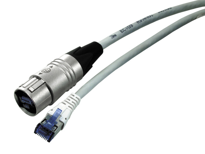 The preassembled etherCON® Cat. 6 patch cables use a shielded S/FTP (data rate up to 10 GBit/s). The system is dust and waterproof in mated condition (IP65). Side a: Neutrik etherCON cable connector shell with sleeve / Side b: RJ45 connector standard