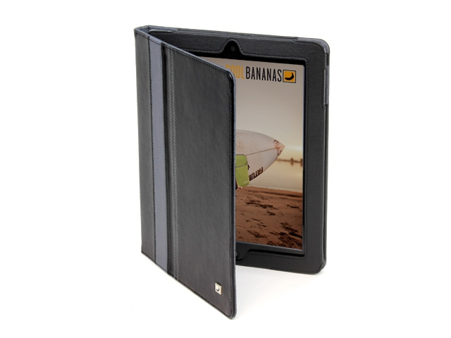 SmartGuy Book leather bag for the new iPad 3 rd gen. in ebony SmartGuy: The nobleman of the Cool Bananas world. 100 percent fine cowhide, 100 percent needlework, 100 percent noble, pure design: This smooth case is for the ambitious ones. The snug flap case fits the iPad perfectly. The grey inner microfibre lining brings elegance to the case. High quality workmanship, perfect fit, functional - the SmartGuy speaks for itself. Grey stichting and applications give the ebony black case its distinctive touch. With its new hidden function, the SmartGuy can also be used as an iPad stand - watching movies and typing mails become really comfortable!