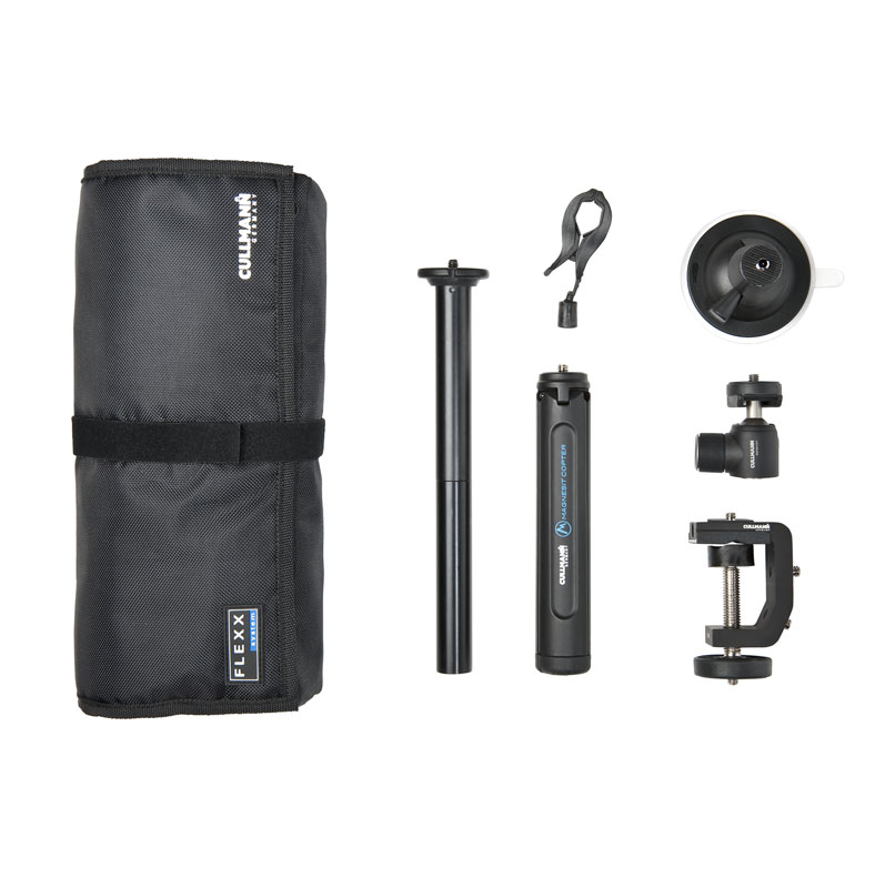 The 6-piece FLEXX Support Set is especially designed for those photographers and videographers who attach great importance to different mounting possibilities and applications. Like, for example, with the multifunction tripod MAGNESIT COPTER which is perfectly suitable as a table top and a handheld support for videography. The multi clamp and the suction pod offer additional mounting variants, thus providing the user with a maximum of freedom for individual camera positioning.