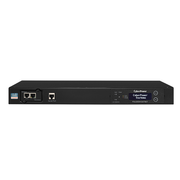 The CyberPower PDU20SW10ATNET, 10-outlet 1U rack mount switched auto transfer switch (ATS) power distribution unit (PDU), provides 100-120V / 20A output. The PDU distributes unfiltered electrical pass-through to 10 NEMA 5-20R receptacles from redundant NEMA 5-20P plugs. Dual power cords can be plugged into separate power sources to provide redundancy to single-corded connected equipment. If power for the primary source exceeds the lower or upper thresholds, or if power fails, the PDU will switch to the secondary power source to ensure continuous operation. The PDU will switch back to the primary power source when incoming power becomes stable.