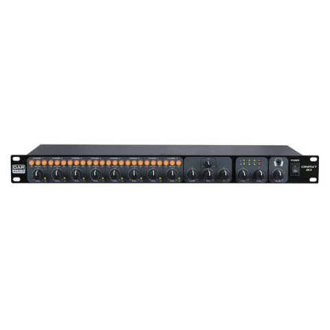 The Compact 8.1 is a high quality 19" 1U microphone line mixer. With some smart features it distinguishes itself from other compact mixers. All inputs can be used for microphone or line level inputs and have high pass filters and phantom power selections for each input separately. It has a balanced master output, a record output and a monitor output. The headphones level also influences the monitor output which makes this an independent extra output for a second area or zone. The main EQ has a mid-frequency sweep which helps you to eliminate the feedback frequency of your system if you use the Compact 8.1 as a microphone mixer. All channels have signal / Clip indicators which gives you a direct overview of your input signals even from a long distance. The Compact 8.1 combines a clear user interface with maximum inputs and smart functionalities on a 1U mixer.