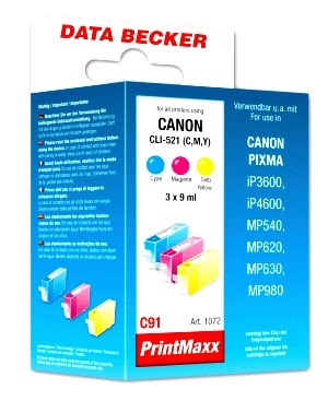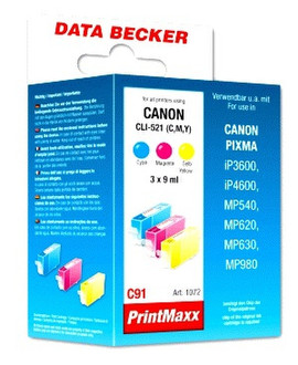 Data Becker C91 Multipack ohne Chip, passend für Pixma iP4600 (CLI-521 C/Y/M). Printing colours: Cyan, Magenta, Yellow, Print technology: Inkjet