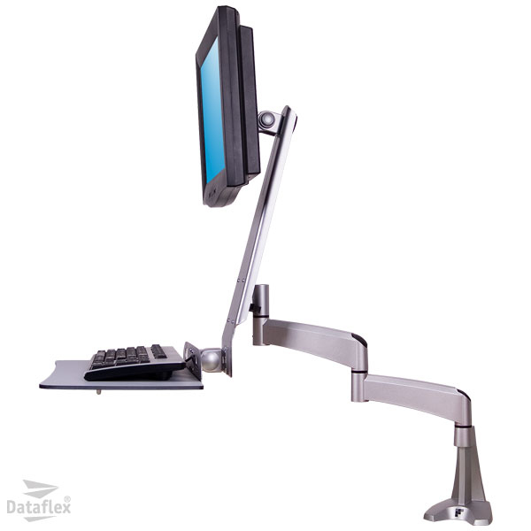 A double extension fixed height desk base. The 90° foldable steel keyboard platform, carries a High Pressure Laminate keyboard/mouse panel. The VESA mounting bracket (75/100mm) for the monitor is height adjustable up to 120mm and has a maximum load capacity of 12kg. Comes with mouse holder and cable management.