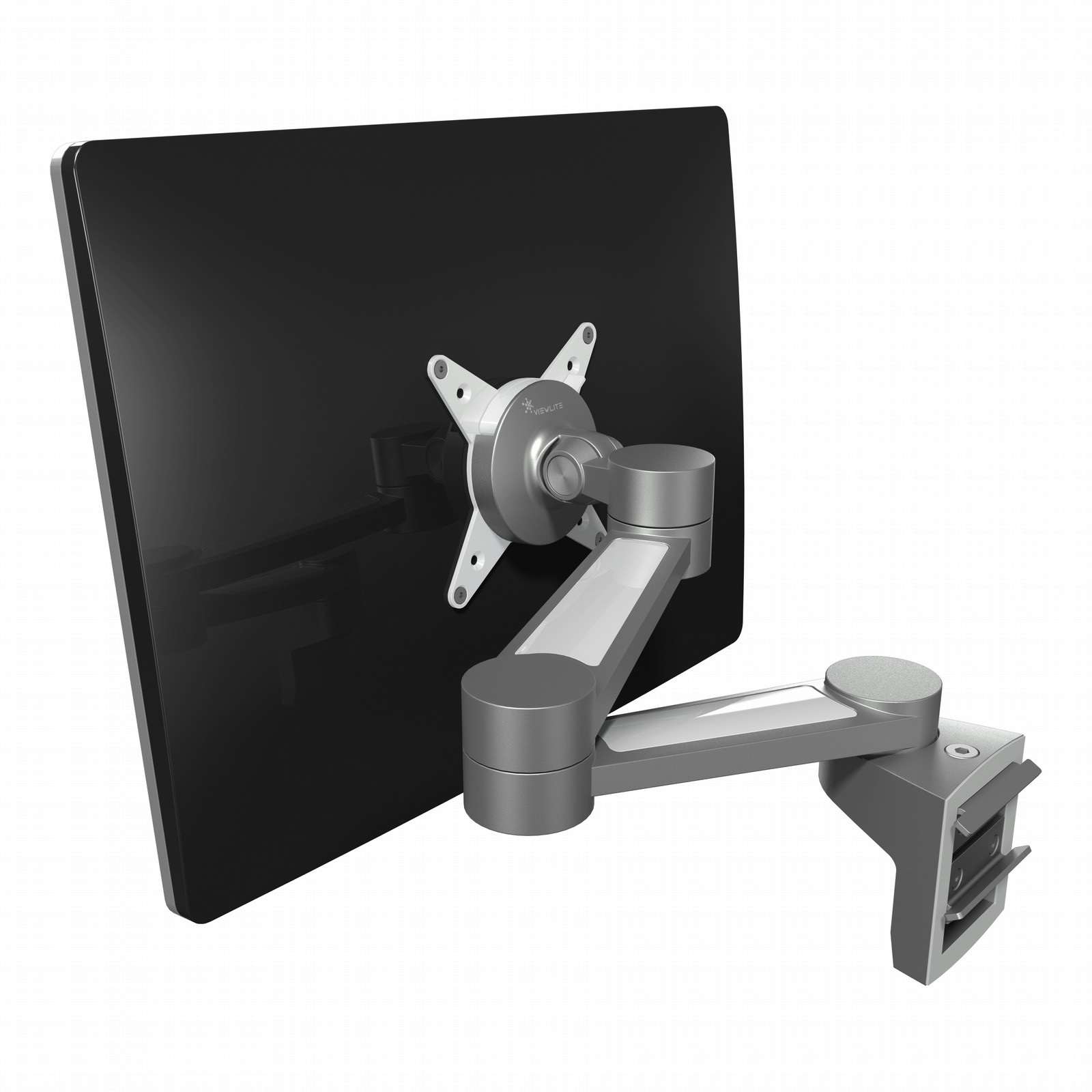 Free up desk space with this monitor arm that mounts onto a slat rail/wall or toolbar. Double extensions let you adjust the monitor's depth independently, making it ideal to span a deep desktop surface. Simply adjust the screw on top to tighten or loosen the clamping mechanism. Cables are easily hidden in the arm's aluminium extensions to create a tidy, professional impression.