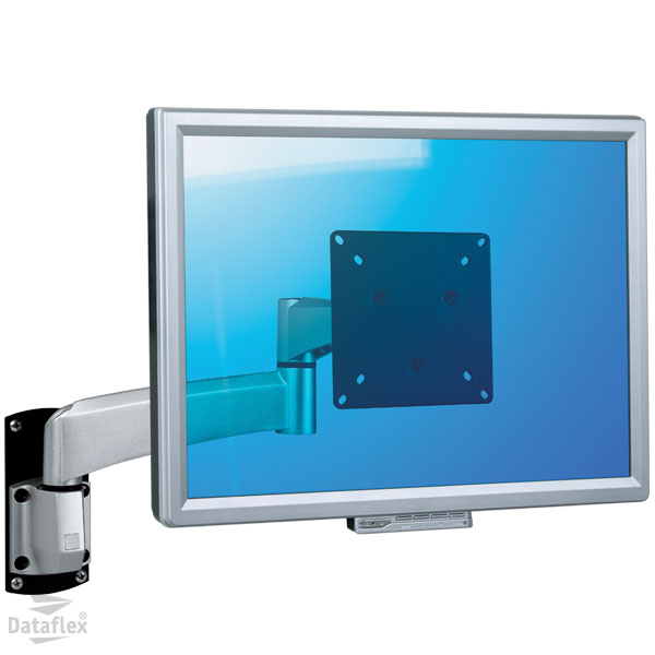 Ball-joint based wall mounted monitor arm with independent depth adjustment. The extension holds and hides the monitor cables.