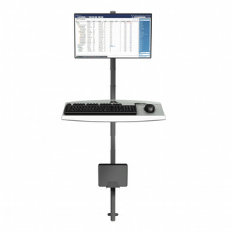 This wall-mounted workstation mounts a PC and monitor and has a platform for a keyboard and mouse. It creates a space-efficient data entry point for areas with limited room. All parts are height adjustable with a convenient clamp lever, so anyone can alternate between sitting and standing without difficulty.