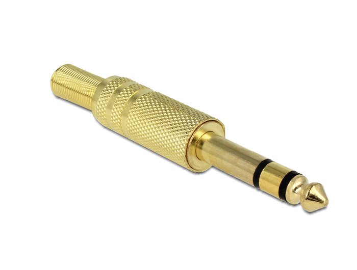 Stereo plug 6.35 mm stereo with bend protection You can solder this stereo plug from Delock to a cable and use it on your devices with a 6.35 mm stereo jack. For soldering, open the stereo plug by screwing and solder the cable on the provided lands. Hard bending spring ensures an overall protection for the cable.