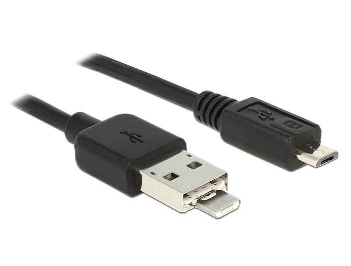 The USB cable by Delock with its clever USB 2.0 type A + Micro-B combo connector offers numerous applications. The Micro-B plug is integrated in the A connector and can be easily slid out and locked. If the USB A connector is used, the cable functions as a data and charging cable for mobile devices with a micro USB connector, such as mobile phones or smartphones, for a direct connection to a PC or notebook. Using the slid out Micro-B connector, the cable enables you to supply a micro USB device, such as smart phones, tablet PCs, smart watches or MP3 players, with power from an OTG-enabled smart phone. The power will be transferred directly from the smart phone to the connected device.
