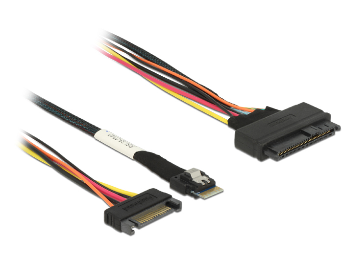 This SAS cable by Delock can be used to connect internal devices, e.g. a device with SFF-8639 connector to a controller with Slim SAS SFF-8654 4i connector.